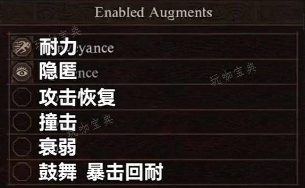 主要推荐耐力、隐匿、攻击恢复、撞击、衰弱、鼓舞、暴击回耐魔。