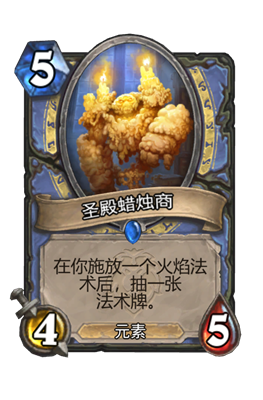 圣殿蜡烛商(Sanctum Chandler)是暴风城下的集结加入的一张法师随从牌。有5点生命值和4点攻击力,并且使用需要消耗5点法力值,在施放一个火焰法术后,可以抽取一张法术牌。