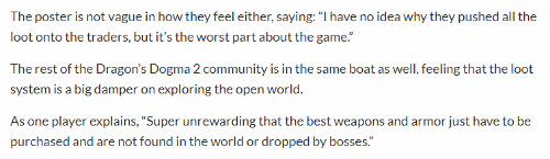 不少玩家表示《龙之信条2》大部分最好的装备几乎都可以通过各个城市的商人获得,他们对此感到失望,更希望通过探索某个地区或打败某个BOSS来获得。