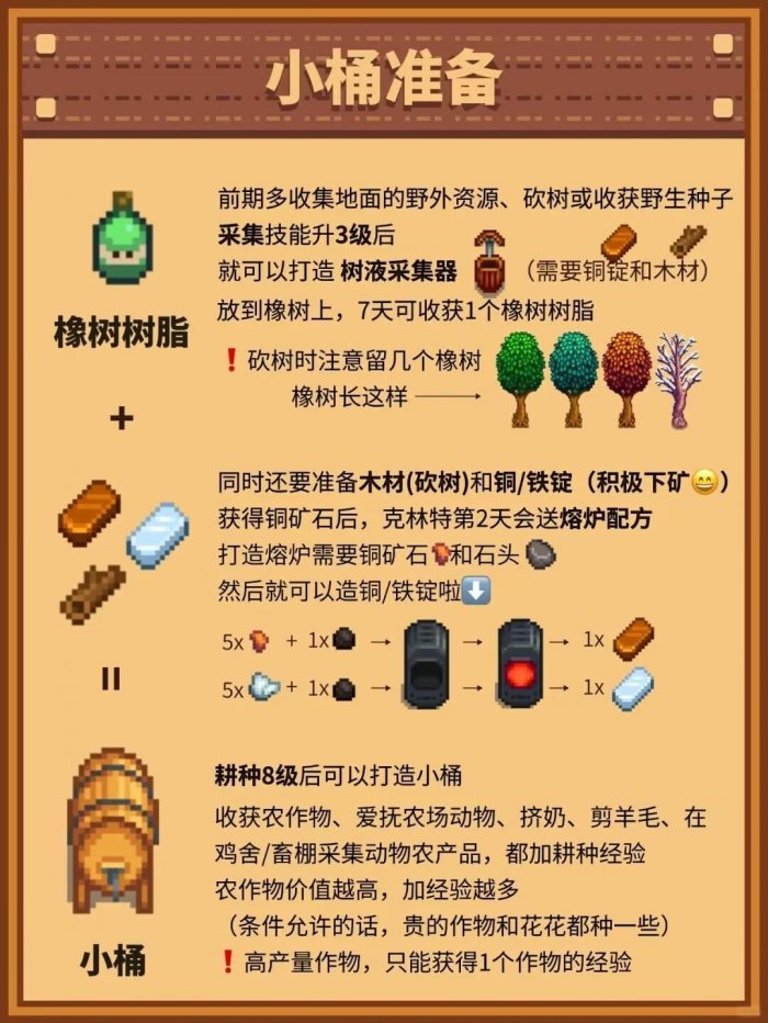 本文梳理下新手酿酒需要提前做的准备工作,不然等耕种8级后发现没有橡树树脂,才傻眼。酿酒的小桶,打造需要:橡树树脂+铜锭+铁锭+木材;前期没钱的时候,需要耕种、采集、下矿三件事