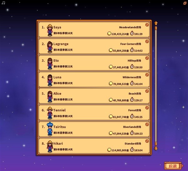 我也久违的回到星露谷继续农夫的生活,新地图完美结局后,这个游戏对我来说也就暂时告一段落了,1100h 的游戏时长确实耐玩,但又因为重复度高会有点无聊。当初玩的时候只把我玩的第一张地图标准农场完成了100%进度,似乎后期的农场布局就成了这个游戏最好玩的地方了。