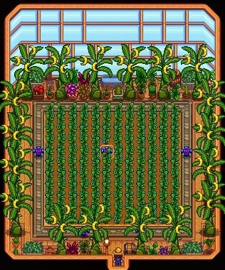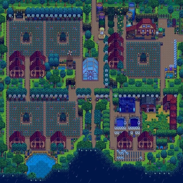 本来以为新版本的更新可以再姜岛农场建房子就可以装修一番,结果没更新,就草草布置一下凑合着用了,48*6=288块地,和288个小桶酿酒,1:1的布局不把负担带回星露谷。