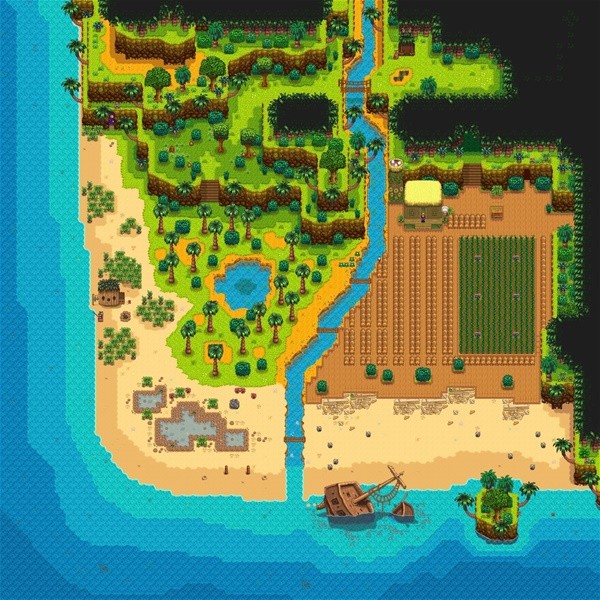 接下来分享一下我的农场布局。我的布局也只仅限在农场和姜岛,没有破坏小镇包括矿场的地形,同样因为都是一个人玩的,所以没有考虑联机小屋的布置。我也没太高审美水平,所以我的布置仅仅停留在实用的基础上。所以没有像其他大佬们那样对农场和小镇进行了美化设计,各个地图布局仅供参考。