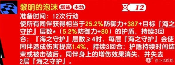 1.使所有同伴获得防御力加成+目标【海之守护】层数的护盾(防御力和技能等级越高加成越高),持续3回合。