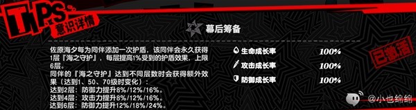 【海之守护】可以让佐原海夕给队友提供防御力和护盾生存能力,同时还可以增加伤害哦,不同的层数还有额外的收益。