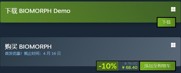 生物形态游戏steam定价为76元,优惠价格为68.4元,折扣截止时间到4月16日。