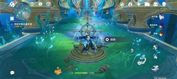 跟随任务指引来到宫殿前方装置旁边,点击“启动”释放灵露。