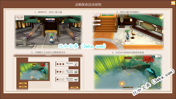 清明——灵鹤探春:在游戏中完成任务大殿建成后,即可在清明节气时于门派大殿内触发“灵鹤探春”活动。