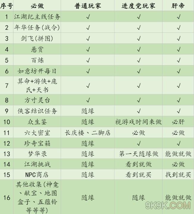 1.射雕第一天必做如下,是针对普通玩家进度党玩家肝帝玩家,密室可开出多流派武学,珍奇宝箱的玉钥可抽取武学。