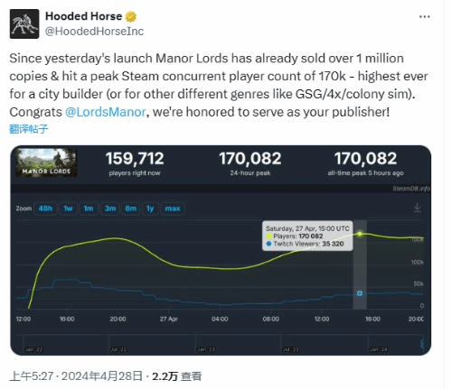 《庄园领主》打破了 Steam 上城市建设游戏类型的纪录,游戏刚发布一天,销量就突破了一百万份。发行商Hooded Horse还表示,本作的Steam同时在线峰值超过了17万人,为城市建设游戏有史以来最高的。