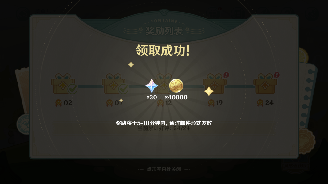 今日共接待7名客人,收获7个赞誉,累积心意达17个。心意交融,总量攀升至24。圆满达成目标,即刻可领取丰厚奖励。