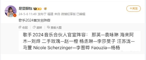 近日,微博热门博主“显眼包”曝光了备受关注的音乐综艺节目《歌手2024》的豪华首发阵容:实力派唱将那英携手袁咏琳,展现音乐魅力;来自民间乐手的海来阿木与刘烨的碰撞,展现出强烈的生命力;二手玫瑰的赵一橙与杨丞琳的李莎子共同诠释青春旋律;汪苏泷马萱这对组合则以电子流行风范亮相。整体阵容星光熠熠,集结了各路音乐人才,无疑将为观众带来一场视听盛宴。