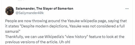 《刺客信条:影》中的武士弥助一角引发争议,尽管玩家们的不满尚未完全消退,一名Twitter用户Sallymander40k揭示了惊人的一幕。他注意到,在本作公布当天,弥助在维基百科上的个人资料竟然被修改了50多次。这一改动不仅凸显了信息变化之快,也暗示了围绕角色设定所引发的广泛讨论和情感波澜。