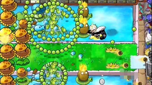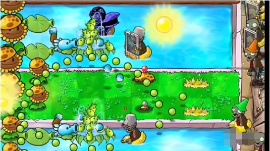 在草坪两翼,每侧植入一株多重豌豆荚。搭配能抵御低温的寒冰香蒲射手,一同对抗强大的敌人阵容。
