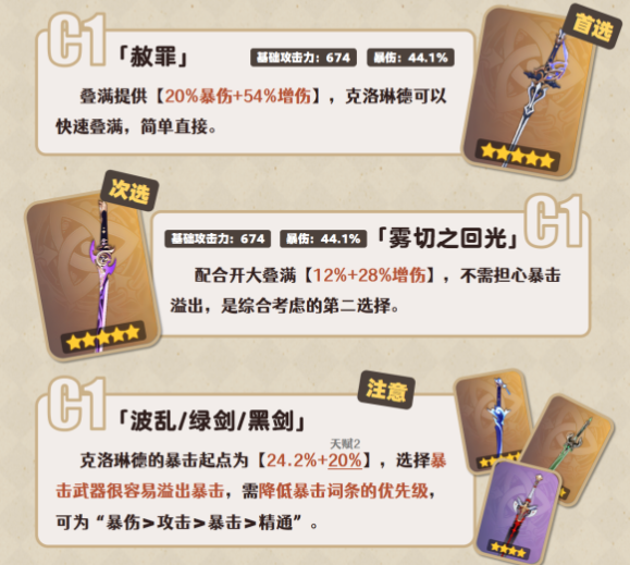 克洛琳德的暴击策略调整为,以基础加上,暴击起点虽高但必须防止过度。为此,建议降低暴击词条的优先级,并设定新的顺序:暴伤>攻击>暴击>精通,这样既能保证暴击威力,又不会溢出。