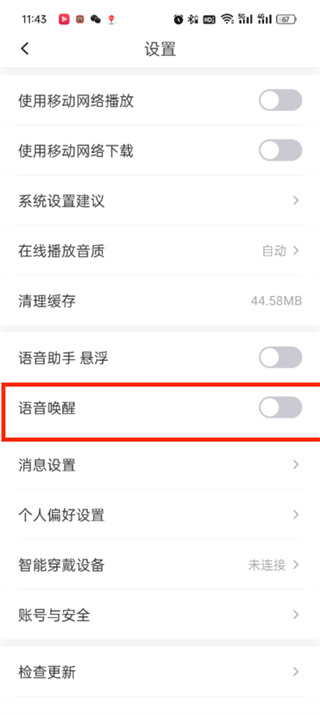 3、最后点击过后来到设置的页面中后我们找到【语音唤醒】功能后点击开启后面的按钮即可;