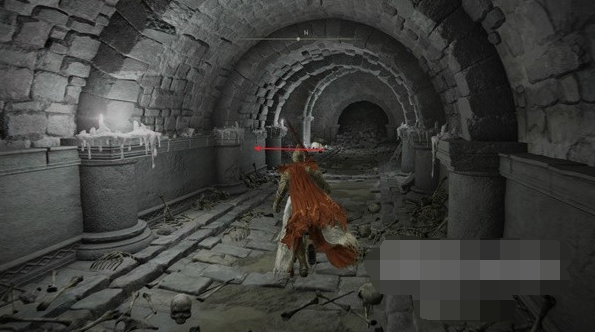 2、进入地下墓地先乘坐第一个升降梯往下走点亮赐福,接着往前走一段距离左转来到一个大厅。