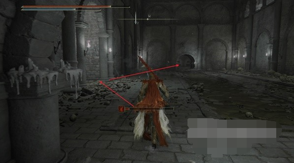 穿过T形路口,面对第一个岔路,选择右边继续前行。继续左转,然后继续左转,一直走到下一个叉口。再次右转,你会遇到使用弹弹魔法的法师。无视它继续前进,到达一个十字路口。