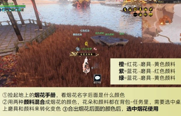 - 将花朵和不同颜色的颜料混合,通过在背包中选择桌面上的磨具和相应的颜色颜料,即可实现烟花的颜色变化。