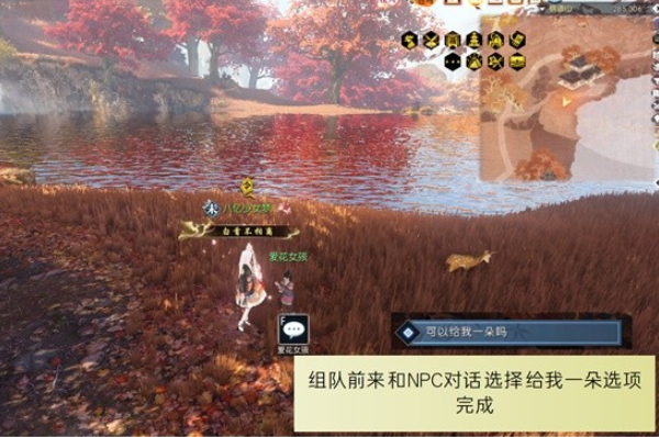在城市中心位置遇到队友,与爱花女孩对话,选择接受任务并完成对话。
