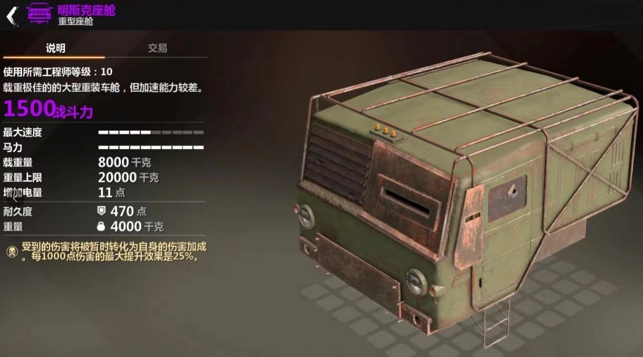 明斯克座舱作为一款重型车辆,在设计上突出了耐用性与高速能力。这款车头的最大速度虽然不是最高的,但其马力强劲,可以迅速提升车辆的运行效率。特别值得注意的是,明斯克座舱的耐久度达到了,非常经受得住战斗中的考验。此外,它还拥有增伤特性,能够在受到伤害时转化为输出加成,这一设计亮点让玩家在面对敌人时更加从容不迫。因此,对于任何想要追求高速度与高耐用性的玩家而言,明斯克座舱都将是不可多得的佳选。
