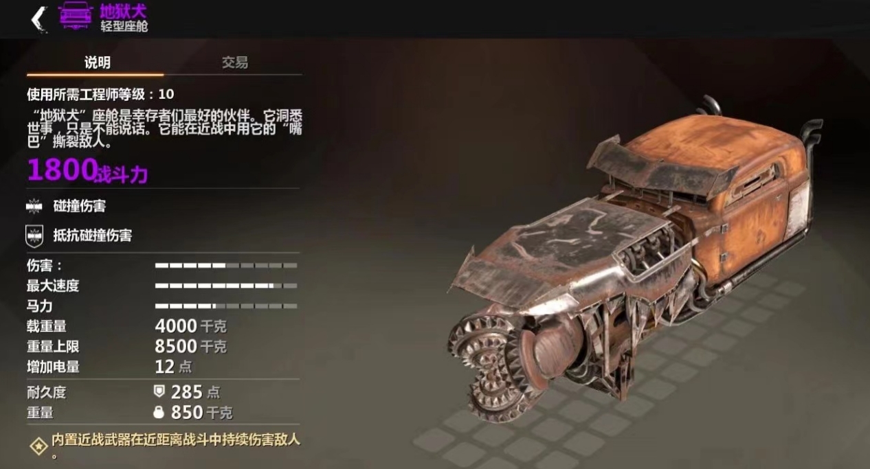 推荐一款特殊的地狱犬车头,该车头拥有近战武器,能直接对紧挨车辆造成伤害。它采用了轻型座舱设计,速度和灵活性都极佳,耐久达到近,是轻型座舱中的高耐久值之一。