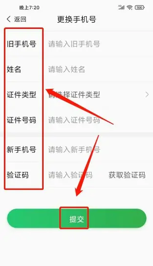 进入更换手机号窗口,输入旧手机号、姓名、证件类型、证件号码、新手机号、验证码,点击提交。