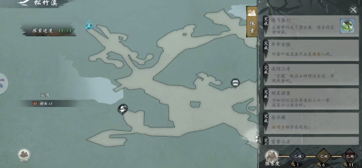 是松竹溪的第一个任务,玩家从坐标发,找到NPC乐无愁对话后,将秦雨落救出。随后进入水井进行战斗,虽然敌人较少但不难对付。之后继续前行前往山洞,在其中四个宝箱中可以获得道具青竹剑法。
