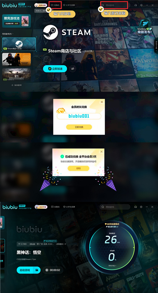 随着游戏的火爆程度不断提高,大boss的存在让玩家在挑战中面临着巨大的困难和压力,同时对网速的要求也随之提升。为了帮助玩家们更好地克服这些难题,biubiu加速器应运而生,为用户提供时免费加速服务。新用户成功注册后,更有机会额外获得时的超长免费加速时长,共可享受时的服务时间。此外,注册即享专属兑换码biubiu更进一步提供了额外时的延长服务,让玩家在游戏世界中自由翱翔,挑战无畏。