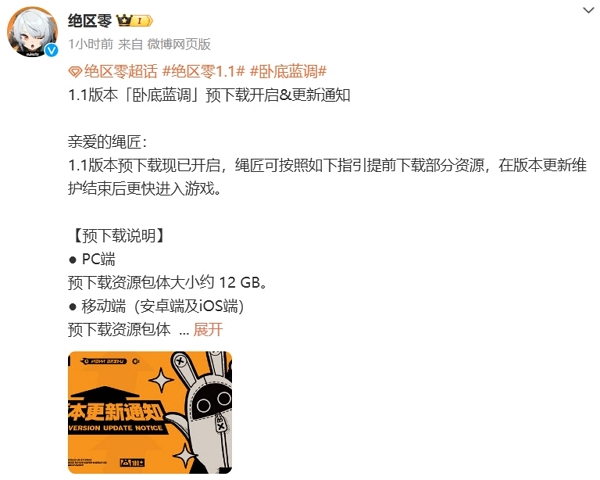 绝区零1.1版本卧底蓝调预下载今日开启。绝区零1.1版本卧底蓝调即将正式上线,当前游戏版本预下载已经开启,玩家预下载后可在版本更新后更快进入游戏。