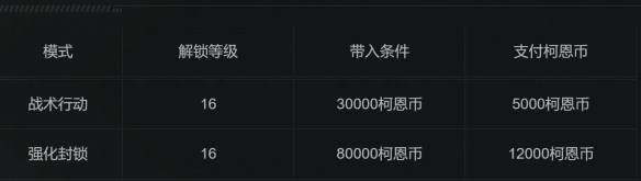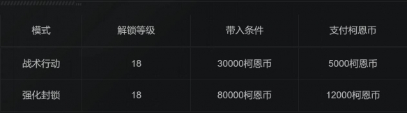 1、战术行动:16级解锁,需要带入30000柯恩币,并且支付5000柯恩币。