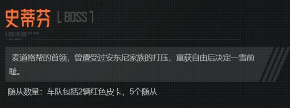 这个特殊boss仅在特定区域(如汽车旅馆、马厩及装卸区)内活动,每次出现时会携带由他控制的随从。