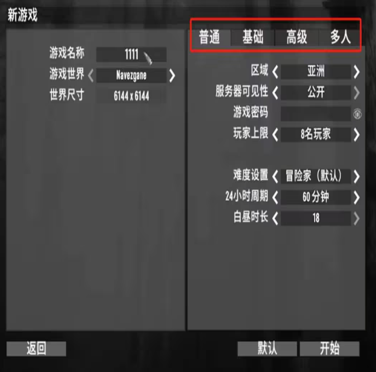 进入游戏主界面时,请选择新游戏开始您的冒险旅程。可以根据自己的口味设定游戏名称和地图,根据难度级别选择普通、基础或者高级模式,并可自行设置公开或私有模式以及玩家人数限制,以便更轻松地找到志同道合的伙伴加入。