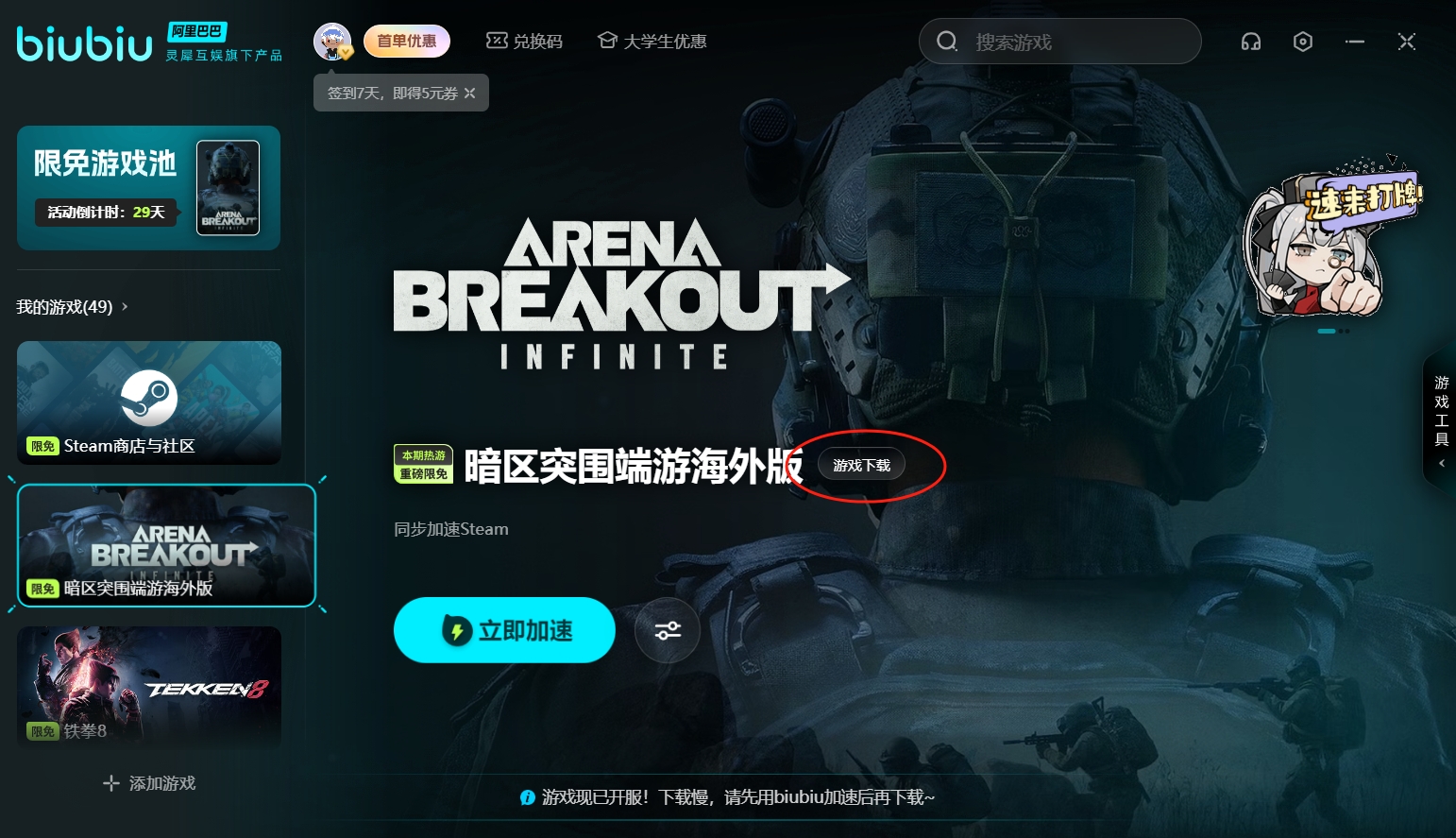 其实想要下载非常简单,只要处理好海外测试这一关就可以了。我们首先去下载一个biubiu加速器,然后在biubiu里面搜索【暗区突围】或者【暗区突围端游海外版】然后在专区的右侧会有一个【游戏下载】的指引,我们点进去就能直接到达海外官网了,这时候直接在官网上下最新的正式版本,下载好之后就能够直接进入游戏进行体验了,大家快去试试吧!