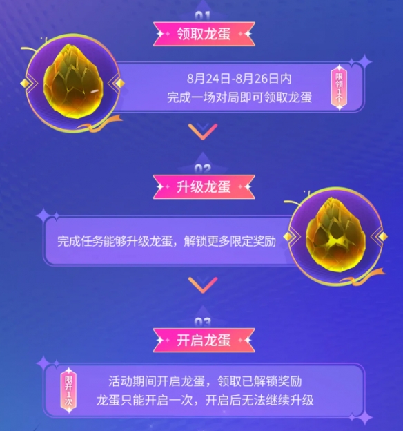 - 请务必在指定时间内领取你的龙蛋。间完成任意一场对局可获得龙蛋。错过领取时间,请关注之后的活动页面。