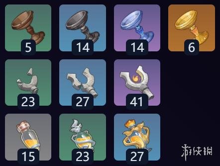 无垢之海的苦盏 *5、无垢之海的银杯 *14、残铅的剑柄*23、未熄的剑柄 *41、微光花蜜 *23、精锻用魔矿 *907、无垢之海的酒盏 *14、无垢之海的金杯 *6、烈断的剑柄*27、骗骗花蜜 *15、原素花蜜 *27、摩拉 *1131445