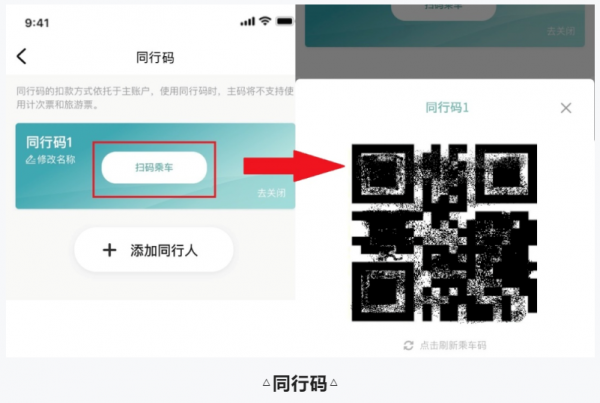 1.同行码出码方式:同行码页面,点击“扫码乘车”。