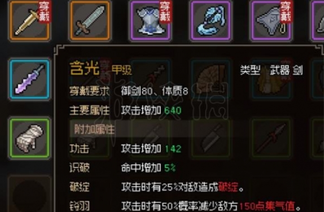 想要在游戏里获得橙色武器可以自行打造,在狼牙剑阁里面只需要使用相应的资源就能自行制造出橙色武器,要注意的是橙色武器出现的几率非常低,除了自行制造之,可以选择在游戏里战胜大师兄,这样就可以在三个橙色武器里面任选一个,首先第一个就是寒光,这是一个甲级武器,想要使用的话就需要体质达到八,御剑达到八十,使用之后角色的攻击力可以增加六百四。