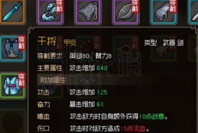 本文介绍了一些橙色甲级武器,包括鱼肠、干将等。其中,鱼肠需要御剑达到八十,敏捷达到八,增加攻击能力六百四;而干将除了要求比例外,其他穿戴条件和主要属性都一样,适合玩家挑选合适的装备进行使用。