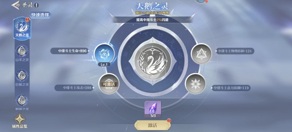 游戏中有五大圣灵:猛禽之灵、孔雀之灵、乌鸦之灵、凶狼之灵和凤凰之灵。每种圣灵都能为斗士带来特殊的额外战力加成,帮助玩家根据阵容需求激活相应圣灵,并分配给不同位置的斗士增加属性加成,在战斗中占据优势。