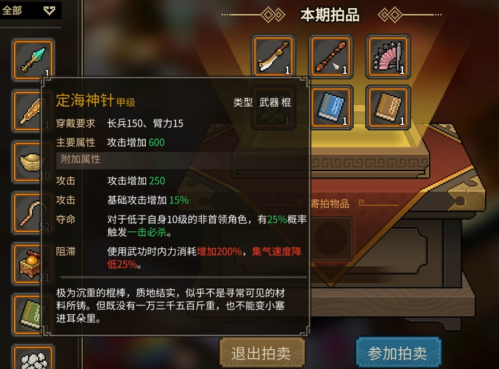 大侠立志传是一款强调探索和积累的游戏,定海神针的获取只是其中的一部分。玩家需要通过完成任务、积累财富和资源,才能在各类拍卖和获取神兵的过程中占据优势。游戏中的每一件神兵利器都有其独特的获取方式和背后故事,这些都需要玩家在江湖中不断探索,方能一一掌握。