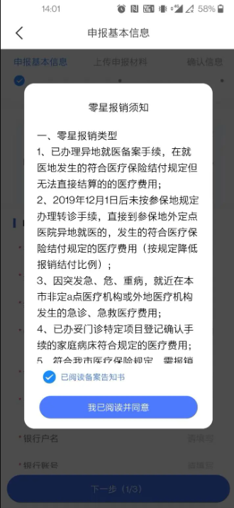 04阅读“零星报销须知”,勾选“已阅读备案告知书”,点击“我已阅读并同意”进入申报页面