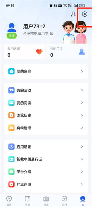1、首先打开智慧中小学app,进入到首页中可以切换到消息、书桌、应用、我页面,我们点击【我】;
