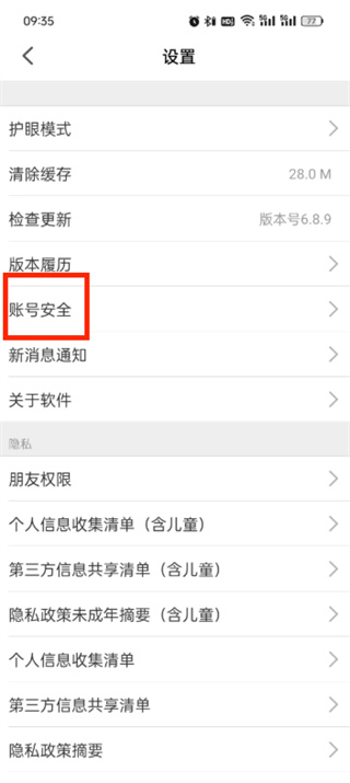 3、接着来到设置的页面中会有很多的功能可以使用,我们需要点击的是【账号安全】;