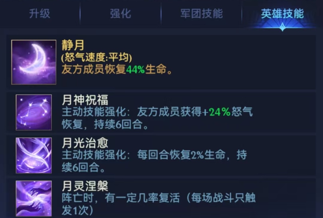 这个角色在战斗中的表现非常出色,可以进行大范围的治疗,并且拥有强化主动技能的效果。第月神祝福可以使有方成员额外获得的怒气回复,而月光治愈则每回合恢复生命值的,持续合。此外,还有月灵涅被动效果,在阵亡时有一定几率复活,但只能在一次战斗中触发。
