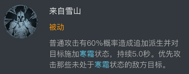 多克拉兹的特性: 多克拉兹拥有雪山之灵被动:可使普通攻击增加四分之一,造成追生效果,并对目标施加寒霜状态。 真正影响对手的是多克拉兹的寒霜状态此状态持续五秒,可以减伤且附带冰霜属性。