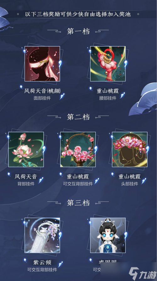 除了惊喜大奖之外,少侠更可额外从三档自选奖励(不可赠送不可交易)中选择心仪奖励加入奖池中。三档自选奖励内容不同,从第一档开始选择心仪奖励加入奖池,若少侠天降鸿运抽中第一档自选的奖励,则解锁第二档资格,选择第二档奖励加入奖池,以此类推。