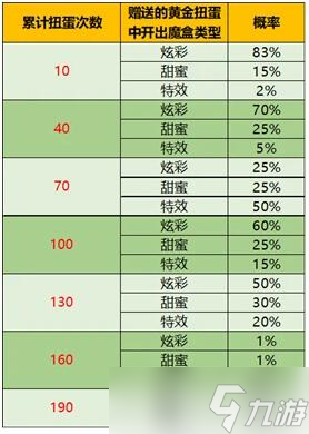 在扭蛋机中,玩家可以通过累计特定数量的抽号获得不同数量和种类的黄金扭蛋。其中,抽取、、、、、和黄金扭蛋将分别赠送一个金色的扭蛋。每个金扭蛋内的魔盒概率根据所抽取的扭蛋次数有所不同。