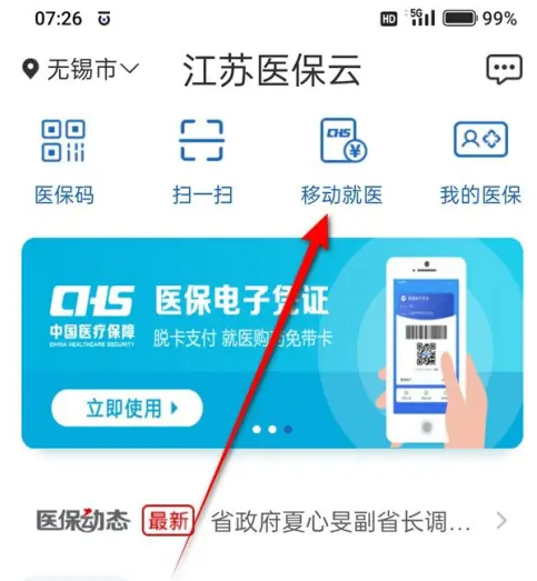 打开江苏医保云主页,点击“移动就医”图标进入。