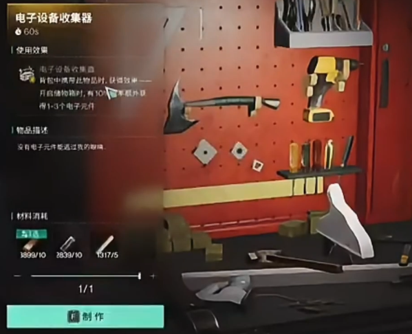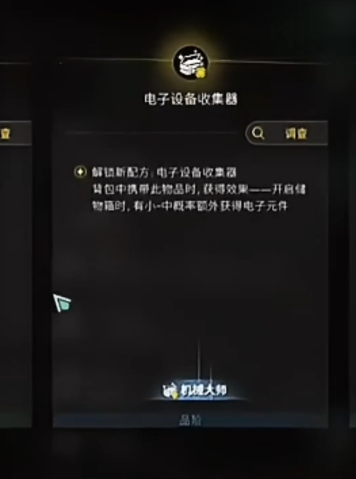 完成任务并通过等级要求后,小伙伴们将被引导至创作平台,解锁名为“电子设备收集器”的装备。这一过程完成后,大家需解锁制作功能。在制作成功后,可以触发Buff效果在这过程中有几率获得电子元件。
